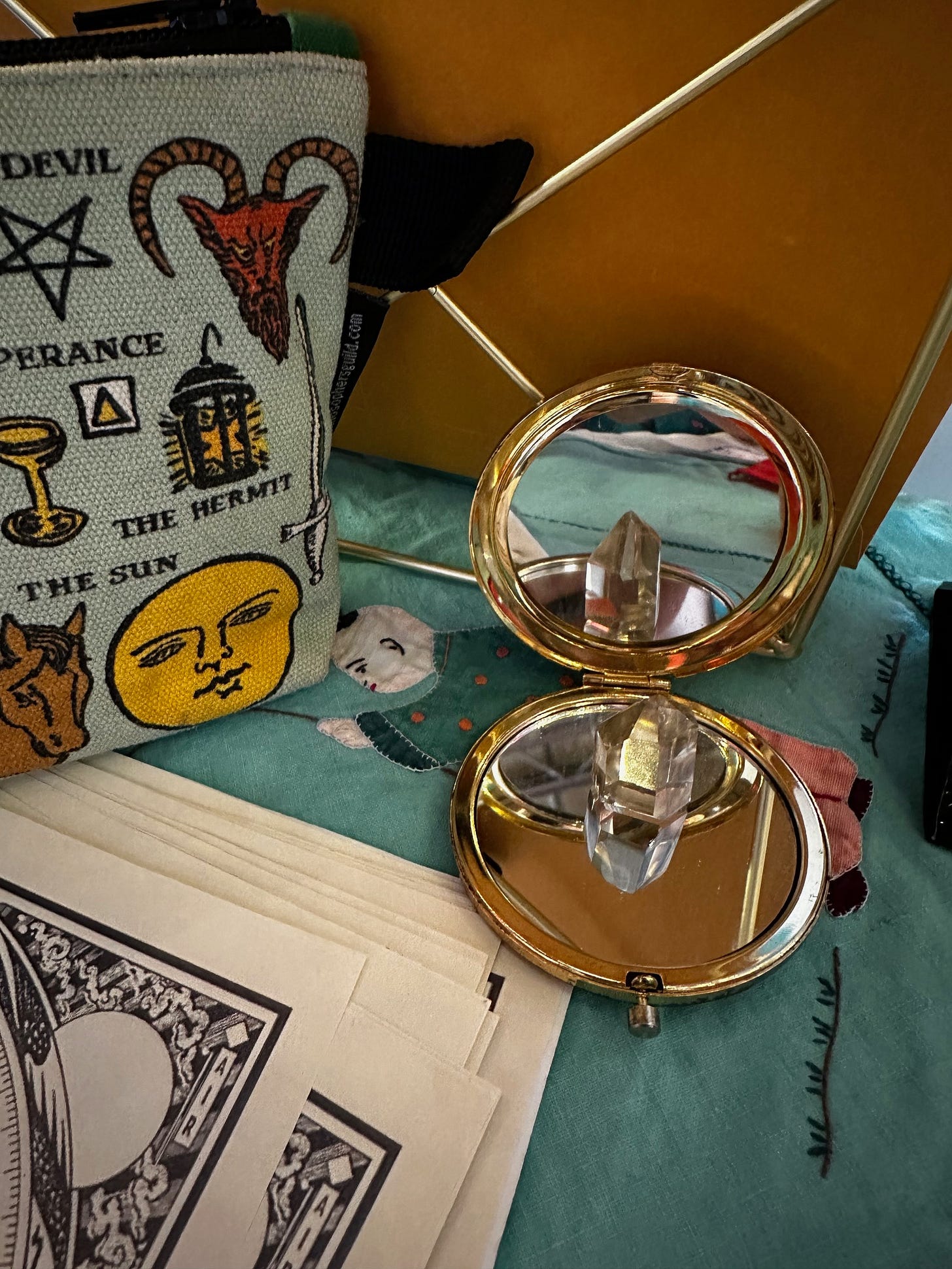I had this vintage card tablecloth that my grandmother owned back in the 70’s. A piece of citrine and (out of site) rose quartz. I brought two decks to give people a choice but everyone chose the Rider Wait Smith deck. Here are some notes from the readings. I only do live events once every few months so I always feel like a new kid at the park: